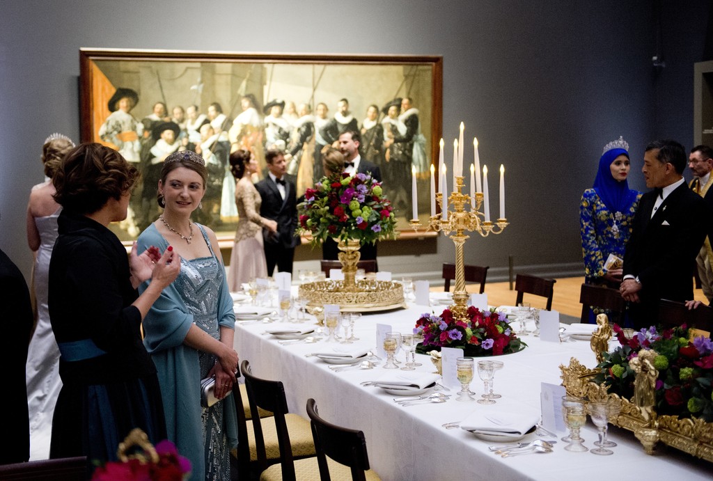 Get out yer sunnies! The blingy brightness volume has been turned to eleven! Tonight in Amsterdam's newly renovated Rijksmuseum, a gala dinner was held in honour of the abdication of Queen Beatrix in favour of her son, Prince Willem-Alexander. Tomorrow, there will be a formal stepping down of the queen back to her moniker of Princess Beatrix, and the investiture of her son to King of the Netherlands, their first male monarch since 1890.